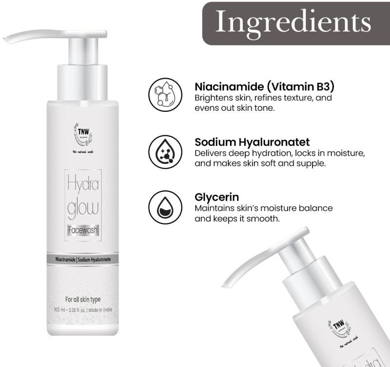 Hydra Glow Facewash gently cleanses while keeping your skin hydrated and radiant. Enriched with Niacinamide and Sodium Hyaluronate, it brightens, soothes, and nourishes skin for a soft, balanced finish. The lightweight formula removes impurities effectively without stripping, leaving your skin fresh, comfortable, and naturally glowing. Paraben-free and cruelty-free, this facewash is suitable for all skin types, giving you a healthy, luminous complexion every day.