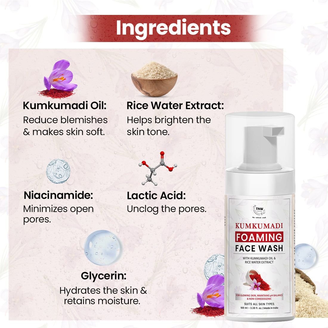 | Key Ingredients | Kumkumadi Oil, Rice Water Extract |